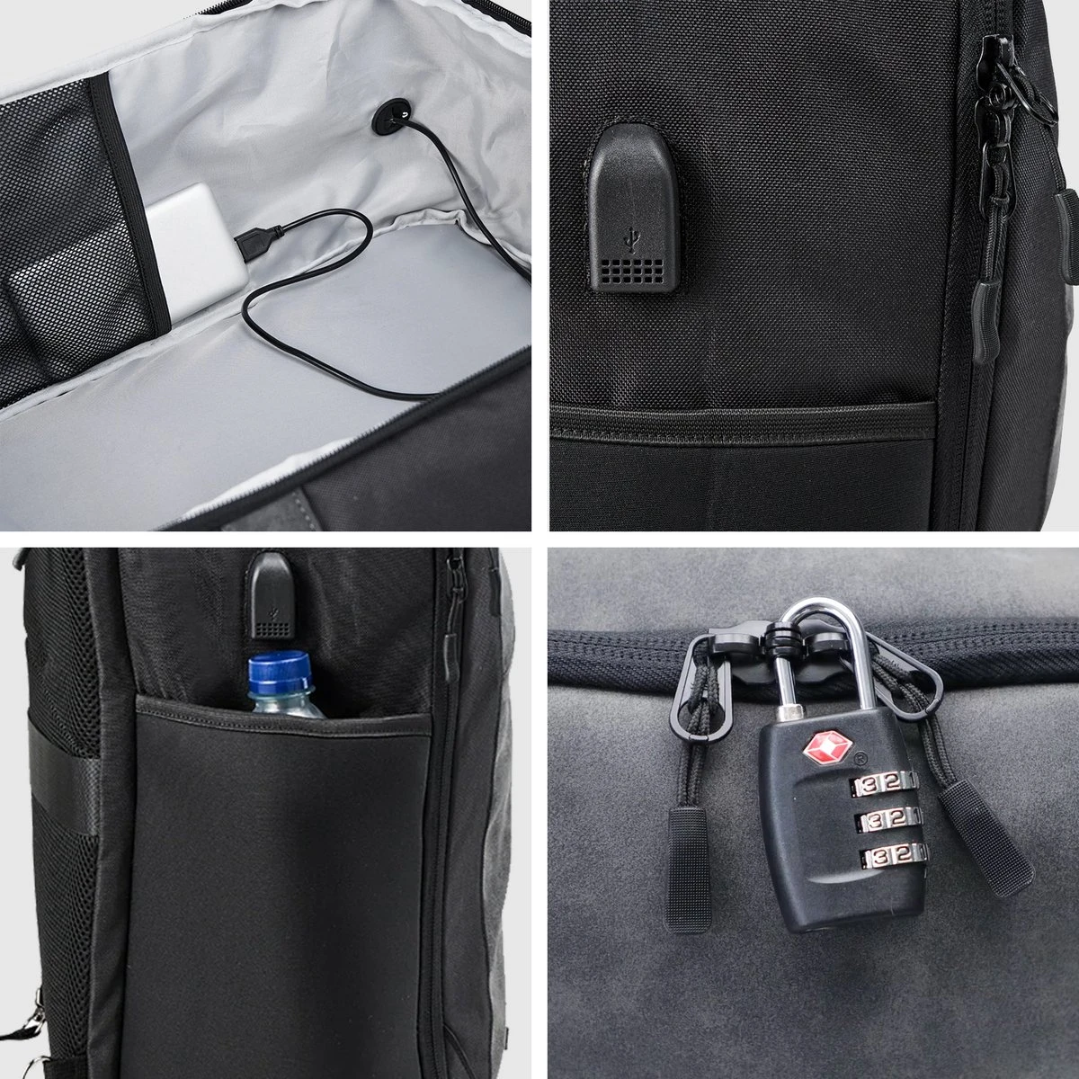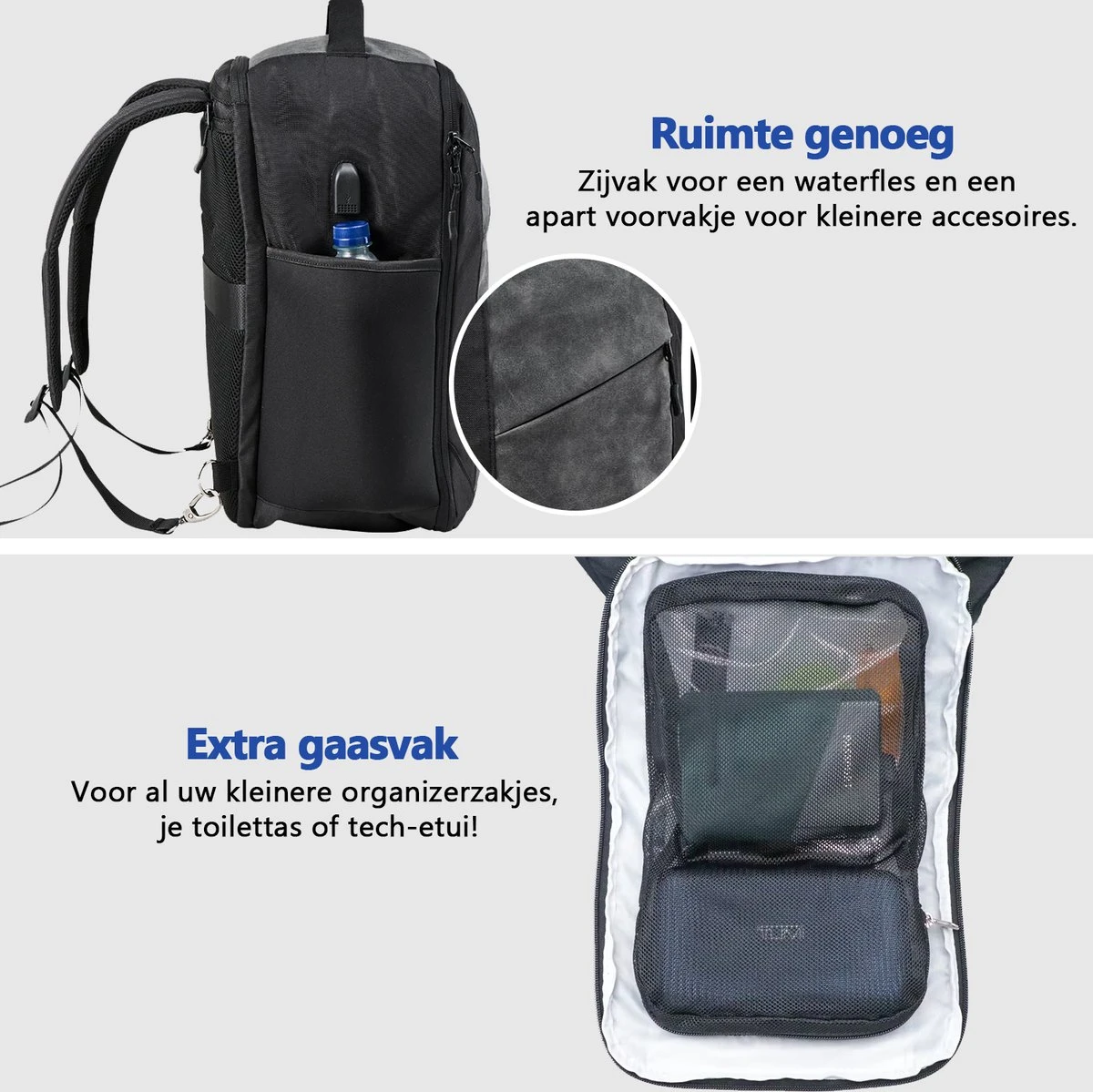 Deze rugzak beschikt over genoeg ruimte en heeft een apart (laptop)vak aan de achterzijde voor het meenemen van een laptop. Vanuit het hoofdcompartiment kan ook een externe batterij op een USB-poort worden aangesloten, zodat je aan de buitenkant van de tas jouw telefoon oplader kunt inpluggen en je telefoon onderweg gemakkelijk kunt opladen. Er is zelfs een extra gaasvak voor overige items, zoals een camera, boeken, of reisartikelen en -documenten. Hiernaast beschikt de tas ook over een zijvak voor bijvoorbeeld een waterfles en een apart voorvakje voor kleinere accesoires.