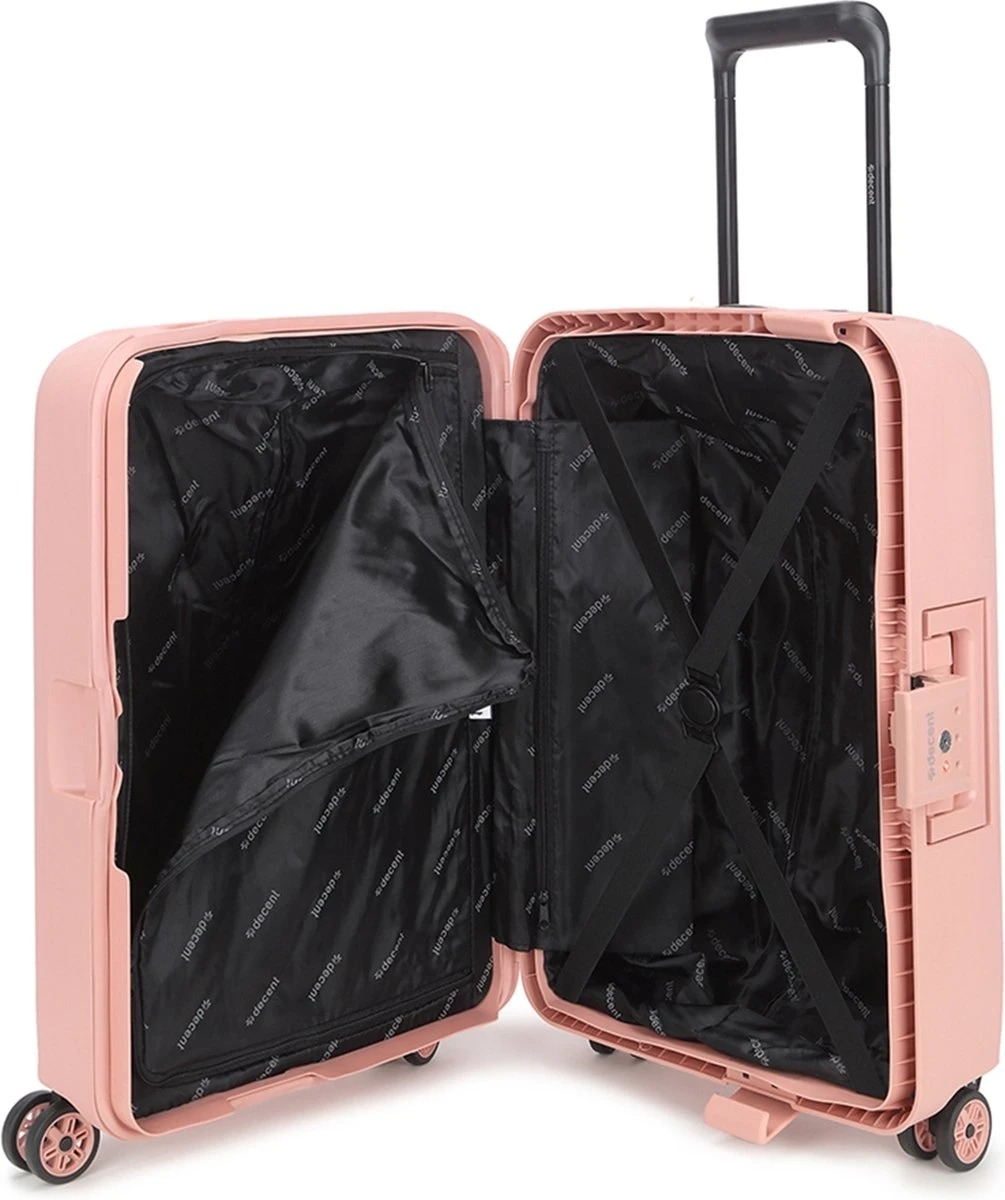 De Axiss-Fix handbagage koffer van Decent is dé ideale koffer om mee te nemen wanneer je een paar dagen weggaat en niet al te veel spullen met je mee wil nemen. De koffer is roze van kleur, compact én licht van gewicht. Daarnaast is hij voorzien van een verstelbare trekstang, twee handvatten en vier soepele roterende wielen. Door deze eigenschappen is de koffer erg comfortabel in gebruik. Het strakke design en de kleur roze maken van deze koffer een stijlvol exemplaar. De koffer is veilig af te sluiten met de driepuntssluiting en het TSA-combinatieslot aan de zijkant.