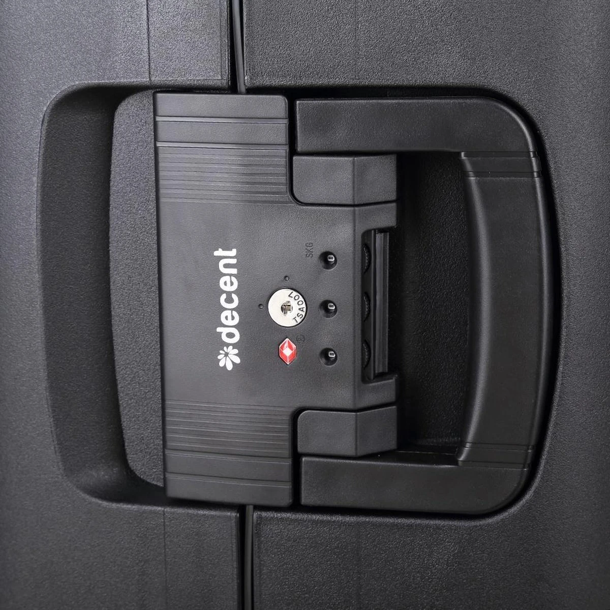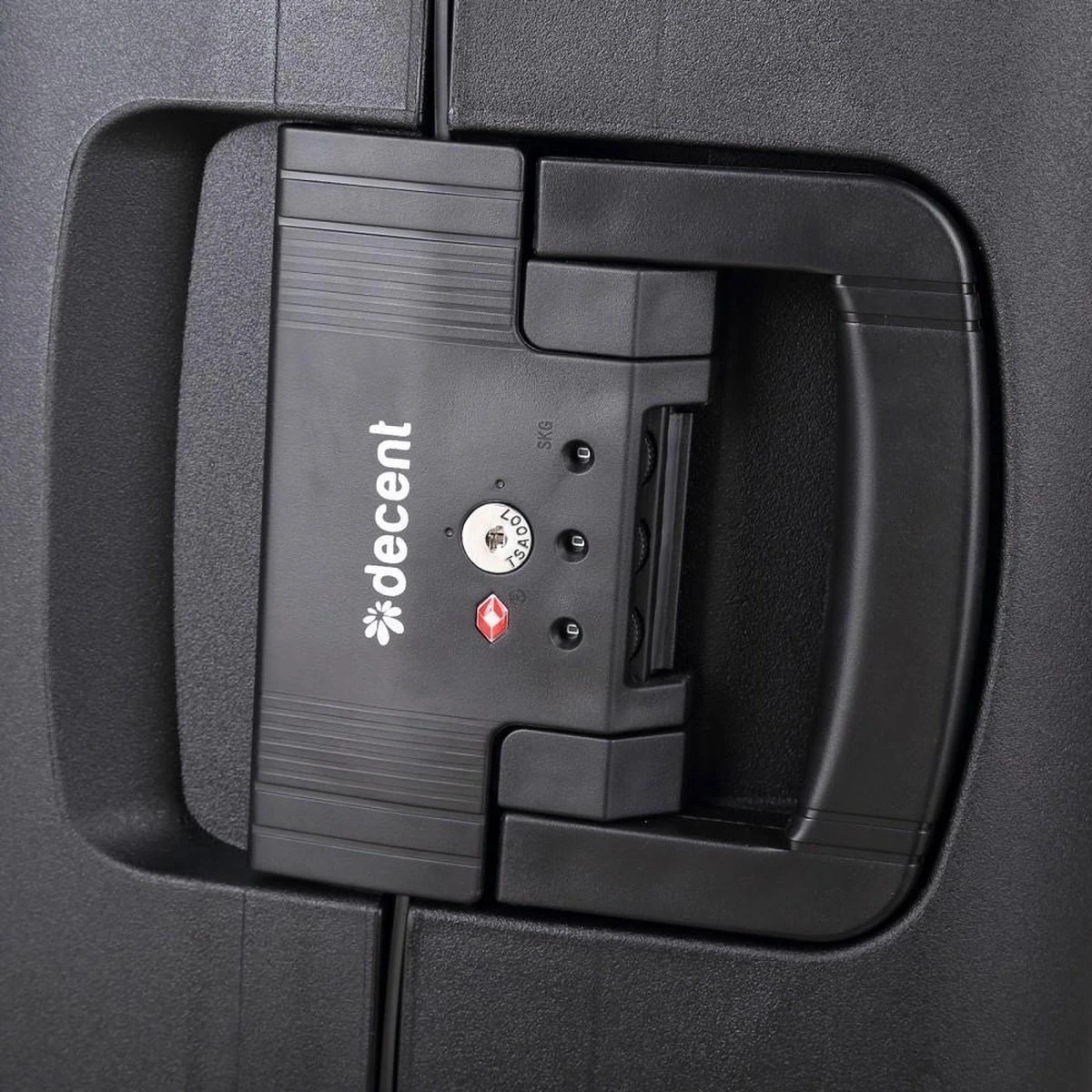 Middelgrote polypropyleen hardschalen koffer uit de Transit serie van het merk Decent. De koffer is rondom voorzien van drie kliksloten. Op de boven-en onderkant zitten sloten die u vastklikt en op de zijkant zit het hoofdslot dat een TSA cijferslot is. De koffer heeft een zwarte voering, een tussenschot met rits, een extra ritsvak en is voorzien van spanbanden. Handvat op bovenkant en zijkant en voorzien van een comfortabel dubbel 4-wiel systeem.