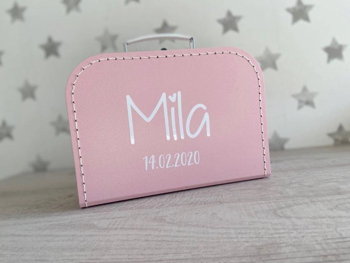 Kinderkoffertje met naam en geboortedatum.Afmeting: 25x18x9 cm (lxbxh). Leuk kom cadeau te geven om ter bekend making van jullie zwangerschap of om mee te geven als logeerkoffer. Kleur van de koffer naar keuze.