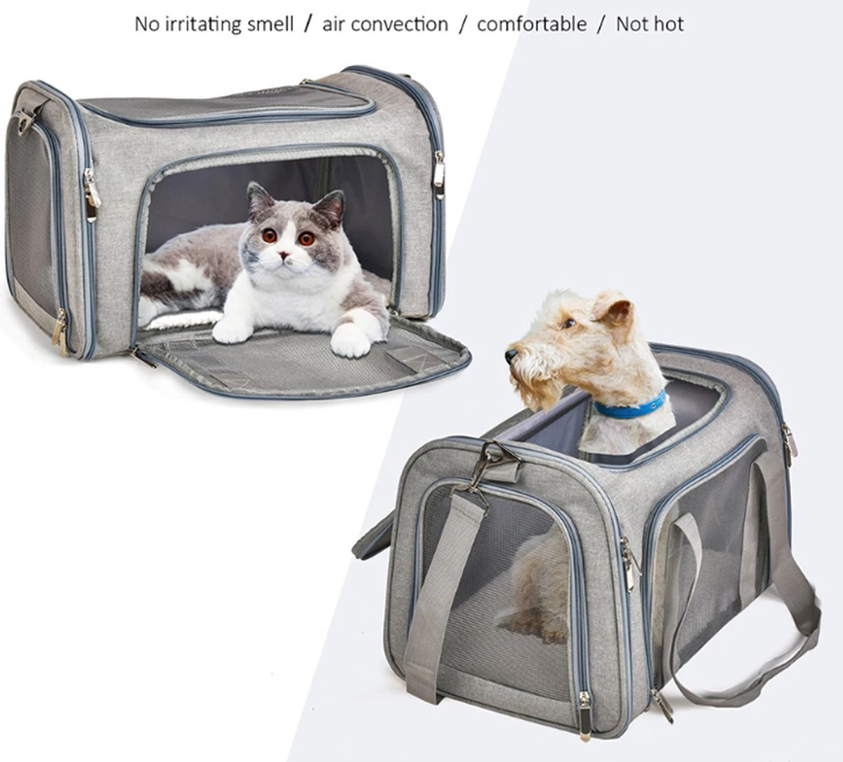 De tas is ademend waardoor het beestje schone en frisse lucht binnen krijgt.