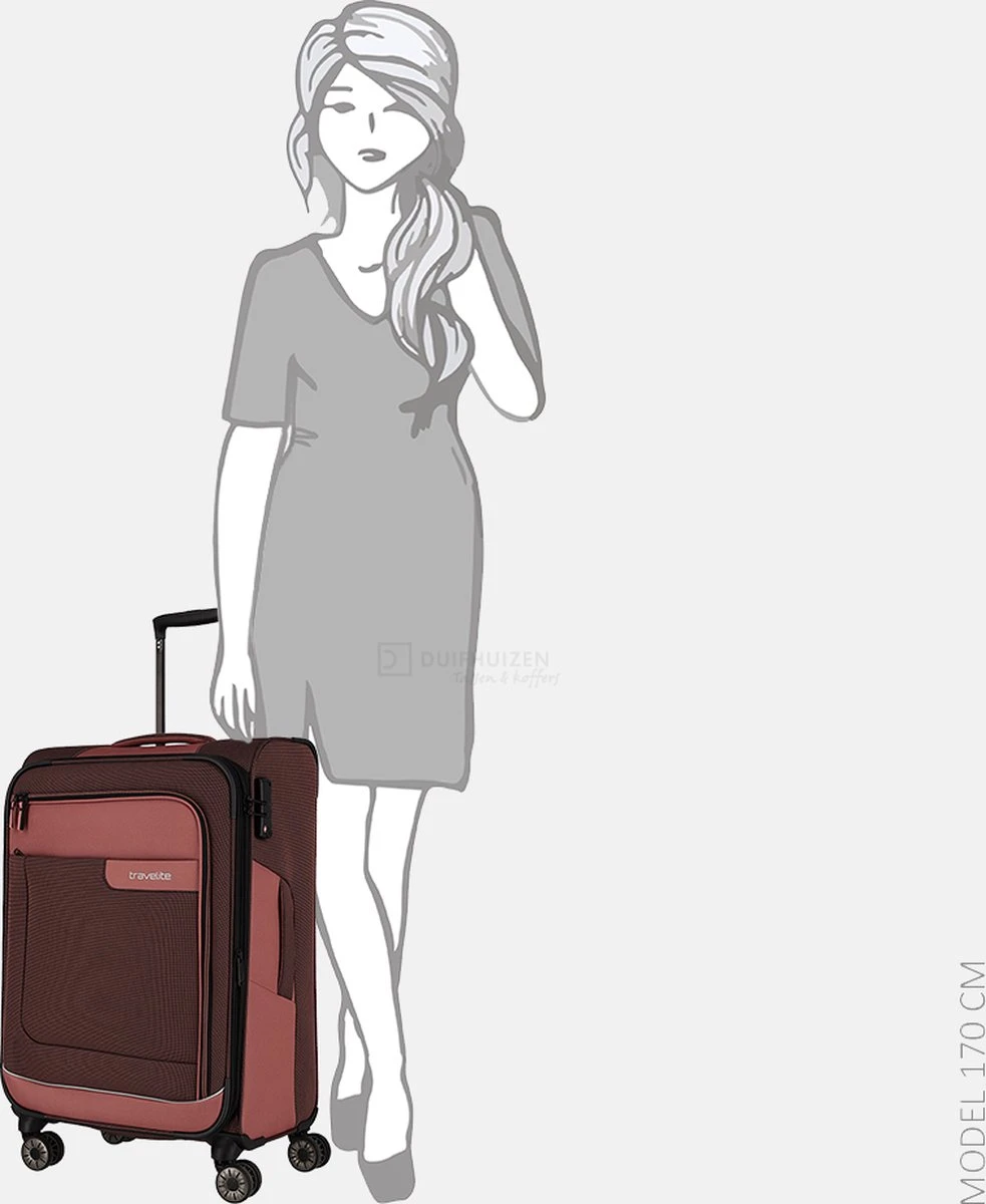 Op zoek naar de perfecte koffer om al je spullen in mee te nemen? Dan is deze Travelite Viia koffer misschien wel de perfecte keuze voor jou. Deze koffer is geschikt voor al jouw spullen tijdens je volgende (lange) vakantie of zakenreis. De zachte koffer is een ruimbagage koffer, wat betekent dat je deze koffer niet mee mag nemen in het vliegtuig als handbagage, maar ingecheckt dient te worden als ruimbagage. Deze zachte koffer is gemaakt van gerecycled materiaal en polyester en je krijgt een fabrieksgarantie van 2 jaar op deze koffer. Omdat deze Travelite koffer voorzien is van 4 wielen, is de koffer wendbaar en stabiel. Ten opzichte van koffers met 2 wielen is het minder zwaar om de koffer te vervoeren, omdat deze rechtop kan blijven staan. **Je ideale metgezel voor een 2-3 weken trip** Je wilt voldoende ruimte voor al je bagage en je gaat 2 á 3 weken op vakantie? Dan heb je een match met deze zachte koffer van Travelite! Met een capaciteit van 80 liter hoef jij je geen zorgen te maken of je alles wel kwijt kunt in je nieuwe koffer.**Uitbreidbare koffer** Deze koffer van Travelite is uitbreidbaar en hiermee verhoog je het reiscomfort. Met een rits creëer je eenvoudig extra kofferruimte als je dat nodig hebt. Ideaal voor de terugreis, als je cadeaus, souvenirs of andere aankopen wilt meenemen.**Een zachte koffer vs. een harde koffer** De keuze tussen een zachte koffer en een harde koffer is een belangrijke keuze. Wanneer je vaak met de trein, bus of auto reist adviseren wij een zachte koffer. Omdat een zachte koffer flexibel is, kun je deze makkelijker kwijt in de kofferbak van je auto, of tussen de treinstoelen. Dit betekent niet dat een zachte koffer niet geschikt is voor vliegreizen. Ook hiervoor is een zachte koffer prima geschikt. Door de opbergvakken aan de buitenkant kun je bovendien makkelijk bij je belangrijke papieren, je paspoort, telefoon en vliegticket.**Voorzien van TSA slot** De koffer is voorzien van een TSA slot, waardoor je je koffer onbeschadigd aantreft op de bagageband. In de VS is een TSA slot verplicht, maar ook op veel andere luchthavens wordt een koffer met TSA slot aangeraden.